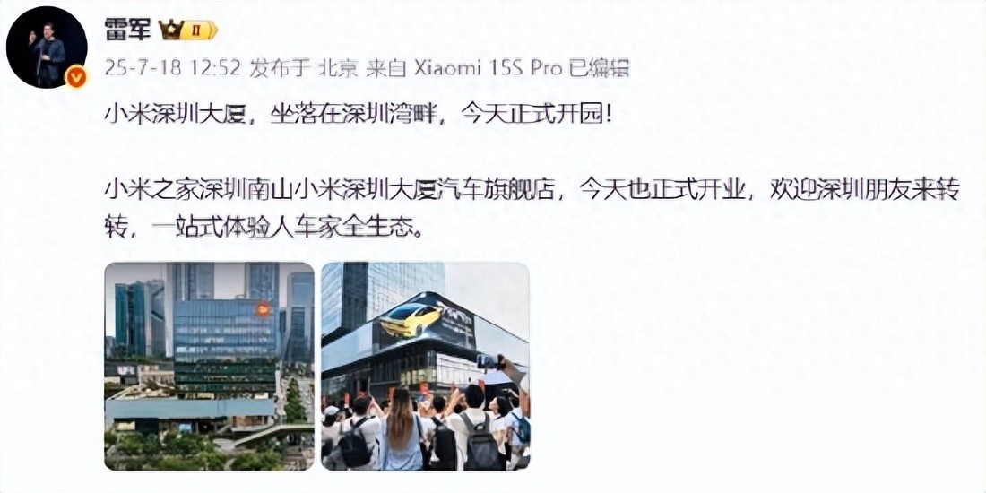 7月18日中午,小米科技有限責任公司創始人雷軍發文稱,坐落于深圳灣畔的“小米深圳大廈”今天正式開園。