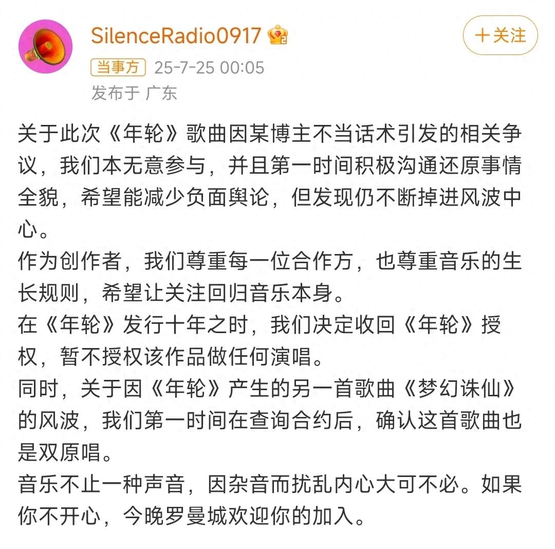 7月25日,汪蘇瀧對接號@SilenceRadio0917 發文:關于此次《年輪》歌曲因某博主不當話術引發的相關爭議,我們本無意參與,并且第一時間積極溝通還原事情全貌,希望能減少負面輿論,但發現仍不斷掉進風波中心。