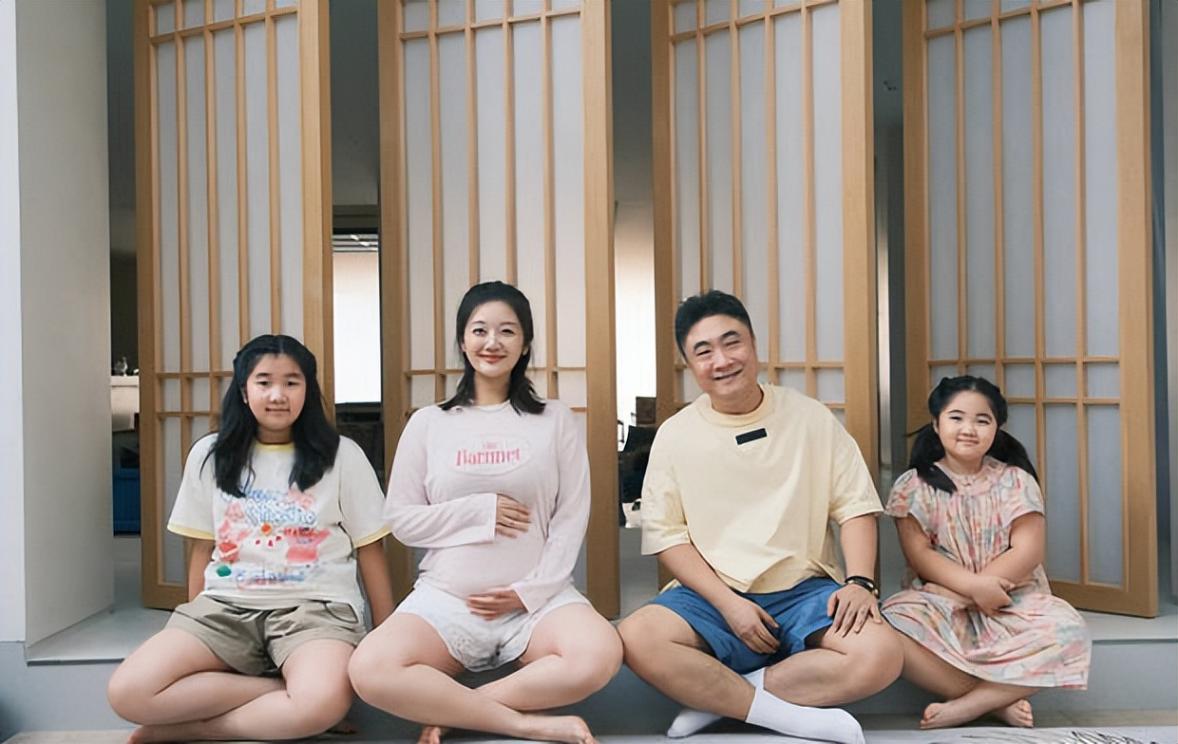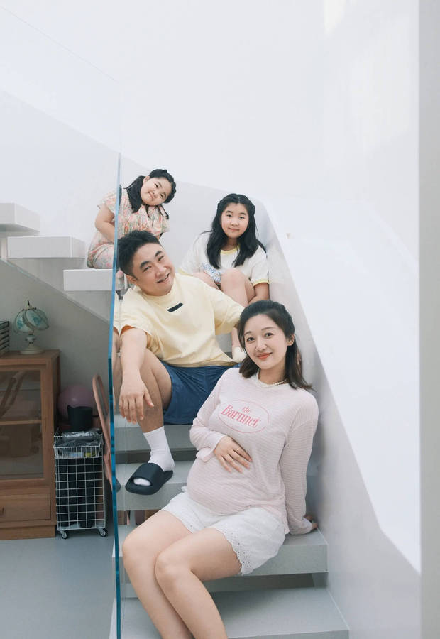 喬杉、莫丹與兩個(gè)女兒一起拍全家福,莫丹雙手抱著自己的三胎孕肚,露出慈祥笑容。