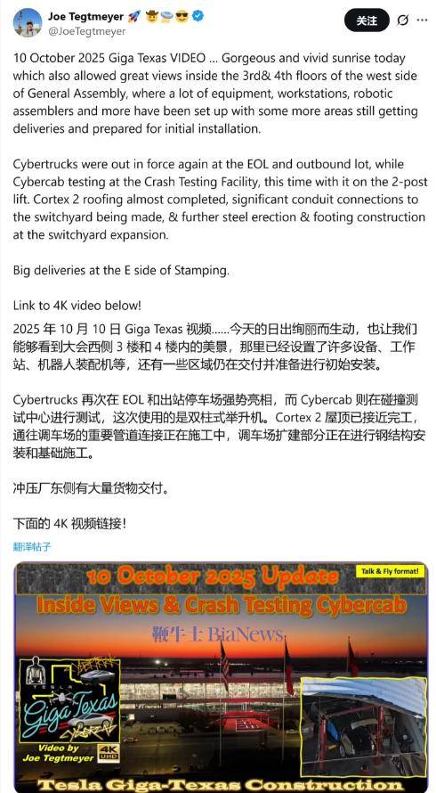 Joe Tegtmeyer分享了一段航拍視頻,拍攝時間為10月10日,地點為德州超級工廠。