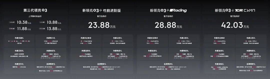 10月17日,成都汽車運動體驗中心(成都領克 MEC)正式啟幕,第三代領克03 家族同步上市。此次上市的車型包括三款第三代領克03 1.5T的不同配置和2.0T Ultra版,1.5T車型限時權益價10.38萬元起,其中2.0T Ultra版限時權益價13.88萬元;新領克03+性能進階版官方指導價23.88萬元;新領克03+Racing售價28.88萬元;新領克03+TCR Cyan售價42.03萬元。