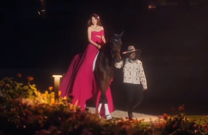 谷愛凌身著一襲明艷的桃紅色單肩禮服,騎著馬驚艷登場,發間點綴花朵掛飾,英姿颯爽又從容,宛如花仙子,舉止之間充滿力量與自信~