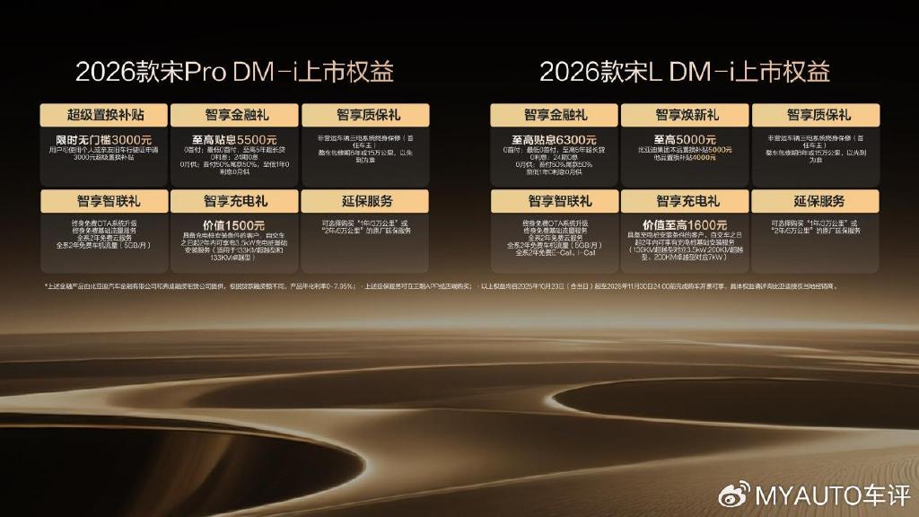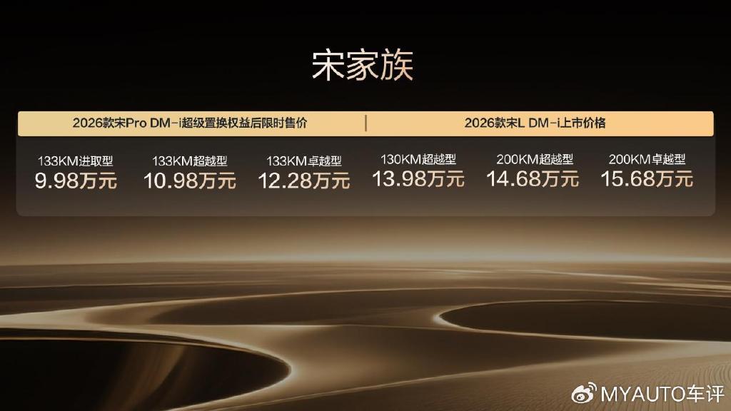 其中,2026款宋L DM-i售價13.98-15.68萬元,2026款宋Pro DM-i超級置換權(quán)益后,限時售價9.98-12.28萬元。同時,兩款車型均帶來了豐厚的上市權(quán)益禮。
