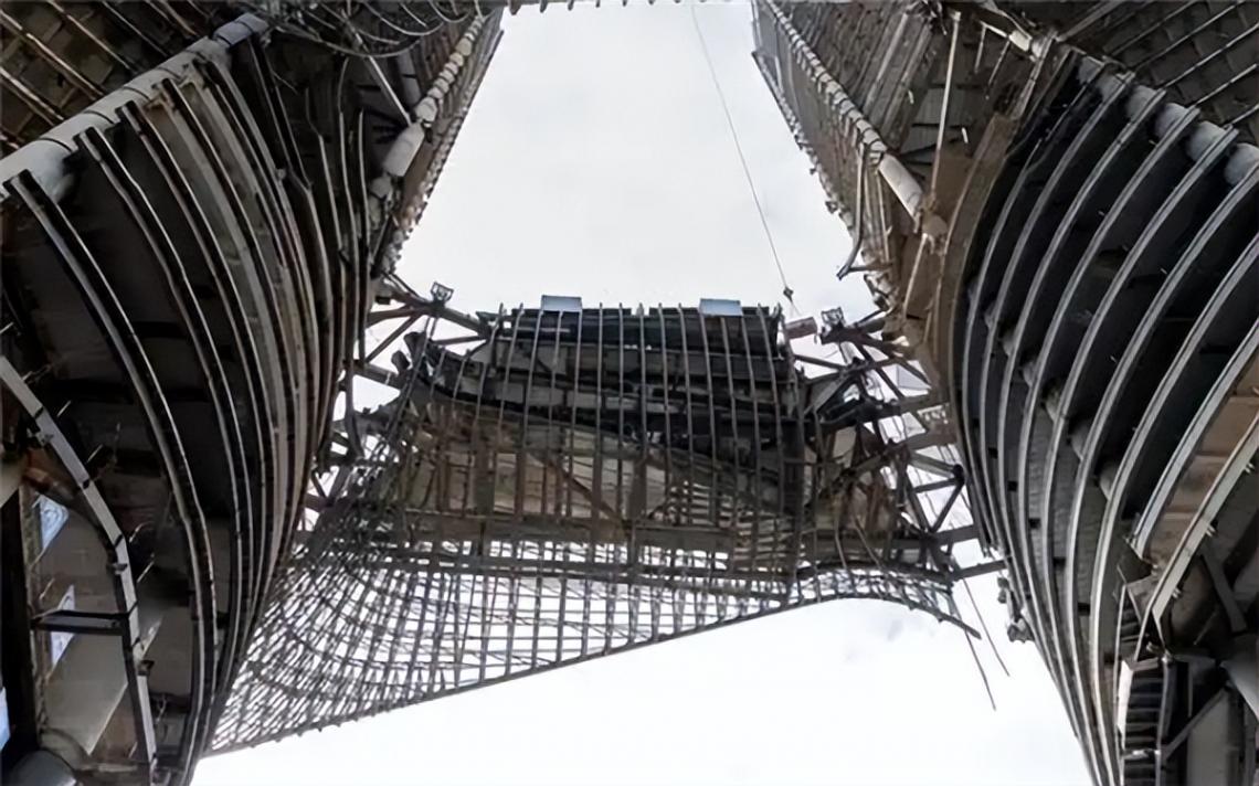 C塔采用超高層雙子塔設(shè)計(jì),東、西兩塔通過(guò)一座結(jié)構(gòu)復(fù)雜的非對(duì)稱連廊緊密相連。該連廊具備“超跨、超重、超高、超精”四大特點(diǎn):最大跨度達(dá)78米,整體重量約6000噸,相當(dāng)于4000輛家用轎車(chē)的總重量;提升高度約120米,約等于40層住宅樓的高度;精度控制嚴(yán)格遵循AESS4.0級(jí)標(biāo)準(zhǔn),達(dá)到毫米級(jí)別。