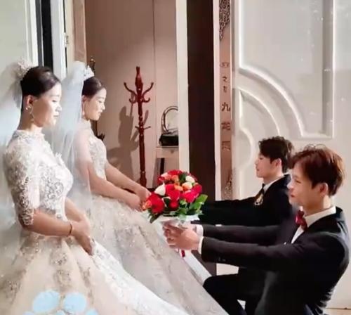 婚禮現場堪稱“人臉識別挑戰賽”:兩對新人身著同款白色婚紗與西裝,發型、妝容甚至微笑弧度都如出一轍。新郎兄弟捧花時,連伴娘團都忍不住調侃:“哥,你牽的是姐姐還是妹妹?”而新娘姐妹更是默契十足,當司儀問“誰愿意嫁給身邊這位先生”時,四人竟異口同聲:“我愿意!”引得全場爆笑。